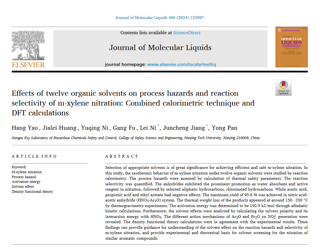 南京工業(yè)大學(xué)倪磊教授團隊在Journal of Molecular Liquids期刊發(fā)表論文《Effects of twelve organic solvents on process hazards and reaction selectivity of m-xylene nitration: Combined calorimetric technique and DFT calculations》,該成果由國家自然科學(xué)基金項目(No. 21927815, 52334006, 52274209)等支持。