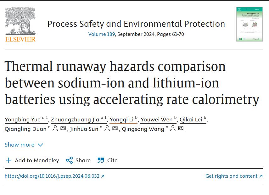 中國科學(xué)技術(shù)大學(xué)王青松教授團(tuán)隊(duì)在Process Safety and Environmental Protection(IF:6.9)發(fā)表題為Thermal runaway hazards comparison between sodium-ion and lithium-ion batteries using accelerating rate calorimetry論文,該成果由中國科學(xué)技術(shù)大學(xué)火災(zāi)科學(xué)國家重點(diǎn)實(shí)驗(yàn)室和中國南方電網(wǎng)發(fā)電有限公司儲(chǔ)能研究所等機(jī)構(gòu)聯(lián)合支持。