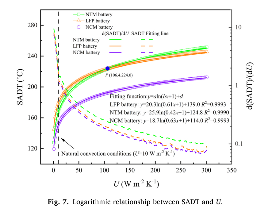 在電池儲(chǔ)存和運(yùn)輸場(chǎng)景中,當(dāng)環(huán)境溫度(T0)升高到一定程度,系統(tǒng)放熱速率大于散熱速率,導(dǎo)致電池溫度持續(xù)上升,直至觸發(fā)電池?zé)崾Э?。此臨界溫度 (T0) 即為 SADT。本研究基于BAC-90A測(cè)試的熱特性參數(shù),結(jié)合熱平衡方程和謝苗諾夫模型。計(jì)算出了三種電池的自加速分解溫度(SADT)與系統(tǒng)表面?zhèn)鳠嵯禂?shù)(U)的對(duì)數(shù)關(guān)系。為評(píng)估電池在不同散熱條件下的熱失控臨界性提供量化依據(jù)。