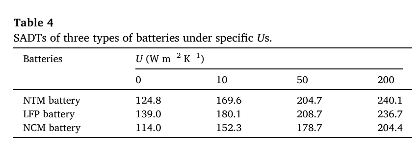 3. 在自然對(duì)流條件下,當(dāng)儲(chǔ)存溫度超過169.6 ℃時(shí),完全充電的NTM電池會(huì)自燃。在電池儲(chǔ)存和運(yùn)輸過程中增加系統(tǒng)表面?zhèn)鳠嵯禂?shù)U已被證明可以顯著提高NTM電池相對(duì)于LFP和NCM電池的安全性。