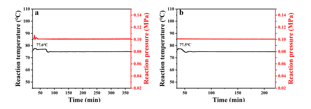 1.使用反應量熱法,在兩組反應條件下,反應過程中均未觀察到明顯的放熱或壓力升高。兩組反應的最大反應溫度分別為77.6°C和77.5°C,均低于溶劑的沸點。