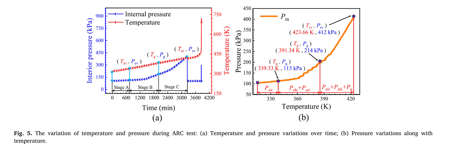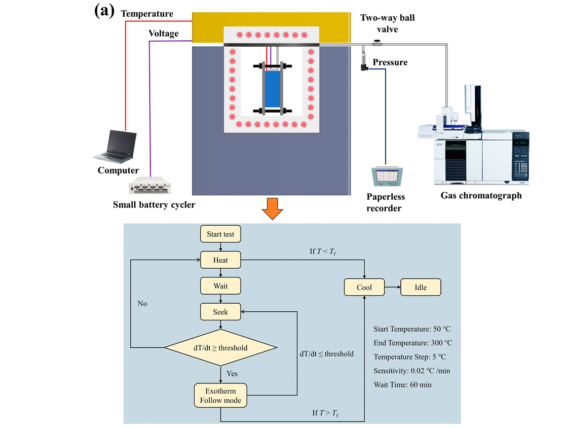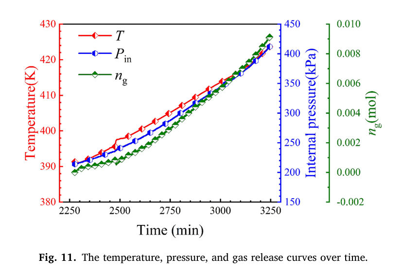本研究中,團(tuán)隊(duì)使用仰儀科技大型電池絕熱量熱儀BAC-420A,并聯(lián)用壓力傳感器、氣相色譜儀等設(shè)備,針對(duì)充滿(mǎn)電的300Ah磷酸鐵鋰電池,對(duì)其在熱失控過(guò)程中的內(nèi)部壓力變化、氣體釋放情況以及溫度變化展開(kāi)了詳細(xì)研究。