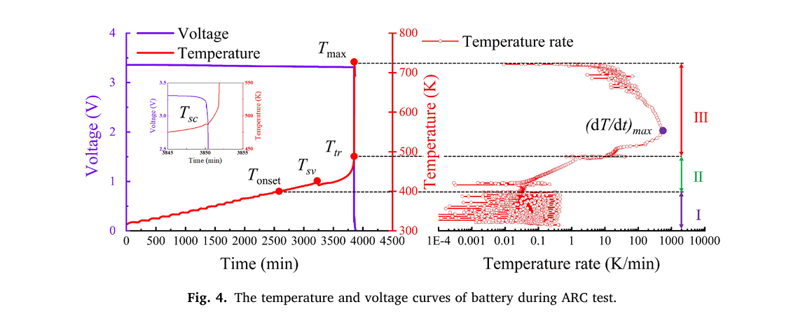利用BAC-420A的HWS模式開(kāi)展熱失控測(cè)試,模擬絕熱環(huán)境并記錄溫度、電壓等數(shù)據(jù)。確定了自放熱起始溫度(Tonset)、熱失控起始溫度(TTR)和熱失控最高溫度(Tmax)等關(guān)鍵溫度點(diǎn),實(shí)驗(yàn)將熱失控過(guò)程分為三個(gè)階段,明確了各階段的反應(yīng)和溫度變化特點(diǎn)。
