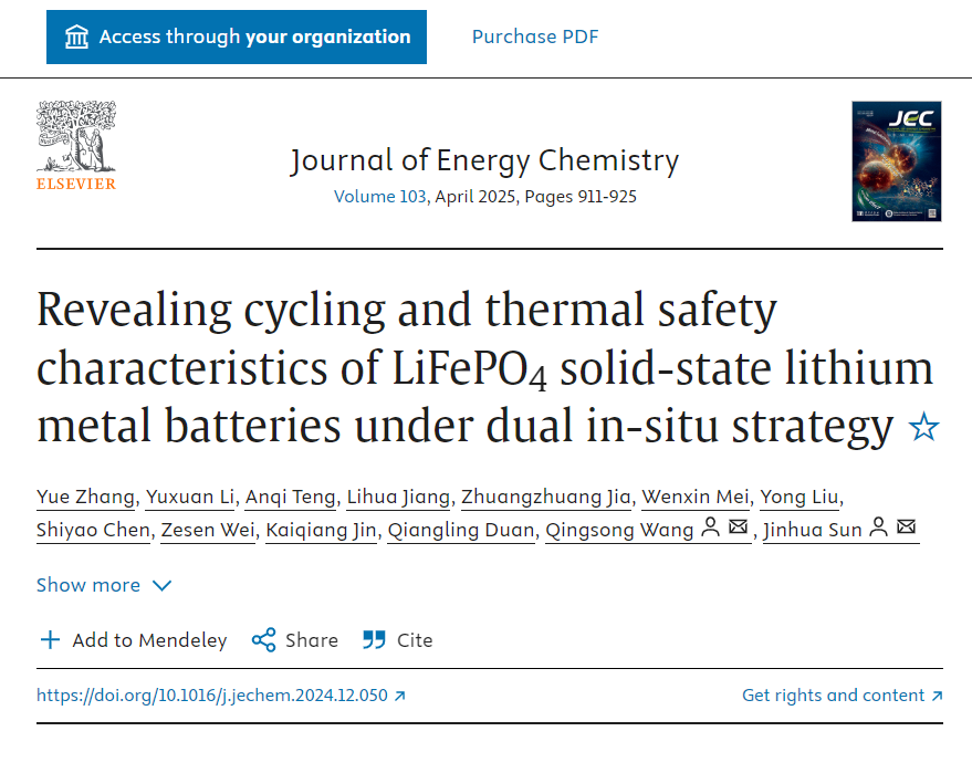 中國科學(xué)技術(shù)大學(xué)王青松教授團(tuán)隊(duì)在Journal of Energy Chemistry(IF:14)發(fā)表題為Revealing cycling and thermal safety characteristics of LiFePO4 solid-state lithium metal batteries under dual in-situ strategy的論文,該成果由中國科學(xué)技術(shù)大學(xué)火災(zāi)科學(xué)國家重點(diǎn)實(shí)驗(yàn)室、廣東省重點(diǎn)領(lǐng)域研發(fā)計(jì)劃(2024B1111080001)、國家自然科學(xué)基金(52204248和52474258)和中國科學(xué)院青年創(chuàng)新促進(jìn)會(huì)(Y201768)等機(jī)構(gòu)聯(lián)合支持。