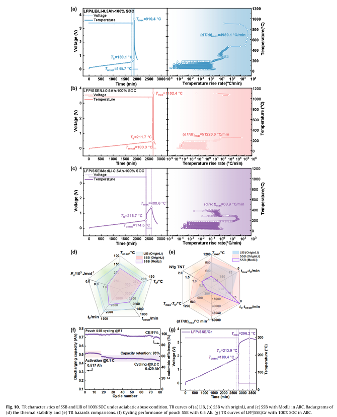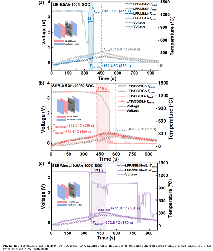 結(jié)果表明,在絕熱加熱熱失控實(shí)驗(yàn)中,固態(tài)鋰金屬電池(SSB)的自發(fā)熱起始溫度相比液態(tài)電池(LIB)滯后超過30℃,熱失控出發(fā)溫度也隨之提升。并且最高溫度以及最高溫升速率的降低也證實(shí)了固態(tài)鋰金屬電池(SSB)較低的熱失控危害性。