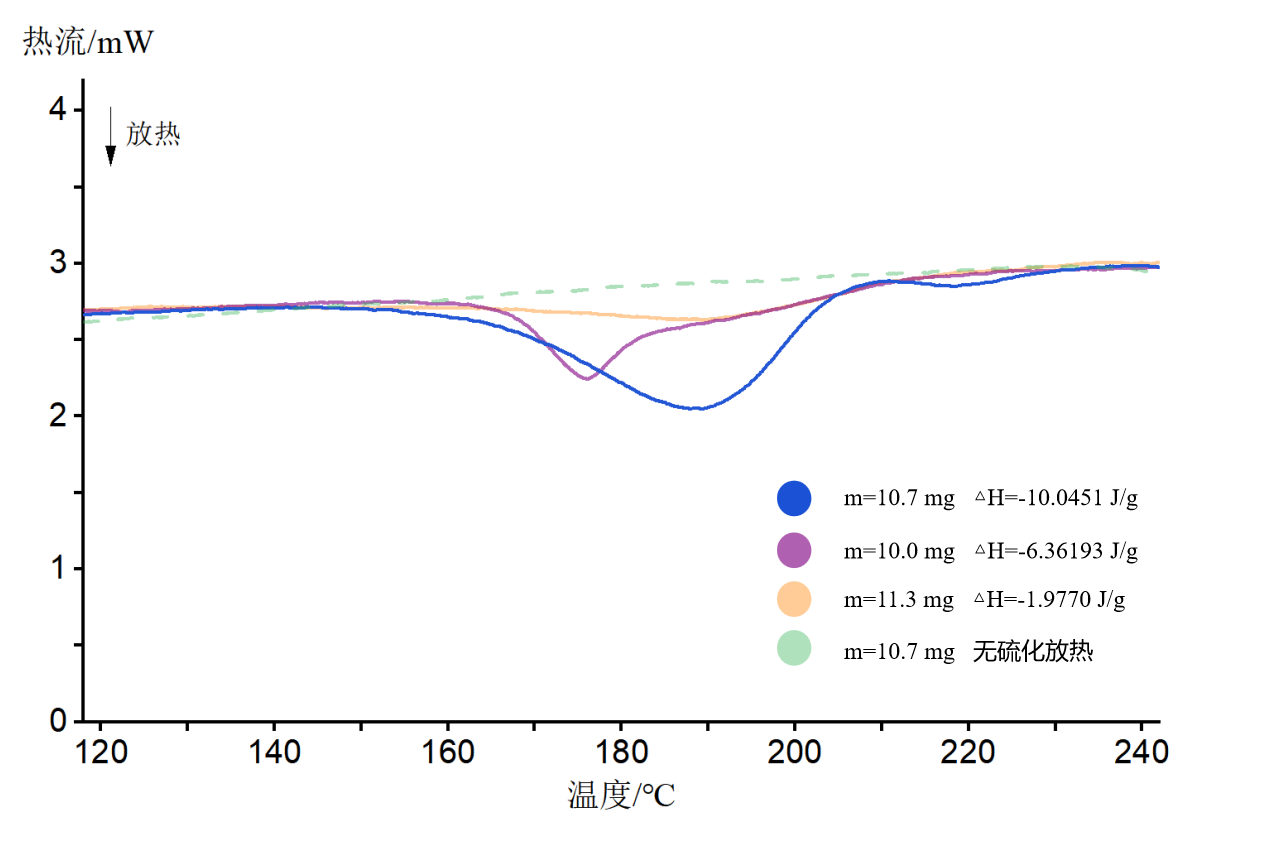 橡膠材料的硫化程度隨硫化時(shí)間變化呈現(xiàn)差異。未完全硫化橡膠的DSC測試中可觀察到交聯(lián)反應(yīng)產(chǎn)生的放熱峰,該放熱峰在首次測試后消失。因此,通過定量分析首次DSC曲線中硫化放熱峰的峰面積(對(duì)應(yīng)熱焓值),可有效評(píng)估橡膠的硫化程度,進(jìn)而指導(dǎo)確定合理的硫化時(shí)間,以獲得具有最佳性能的產(chǎn)品。