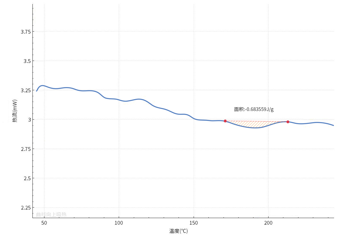 測試結(jié)果表明,橡膠硫化過程的熱釋放效應(yīng)較為微弱,對(duì)測試儀器的靈敏度與分辨率等核心性能指標(biāo)提出了更高要求。在此研究中,DSC-40A憑借其卓越的微弱信號(hào)檢測能力,成功捕捉到低至0.6836 J/g的微小放熱信號(hào)。通過其配套專用分析軟件,可清晰解析該微弱放熱過程的關(guān)鍵參數(shù),如熱焓值(詳見圖3),實(shí)現(xiàn)了對(duì)硫化反應(yīng)的精確表征,這一結(jié)果有力印證了DSC-40A的高性能表現(xiàn)。